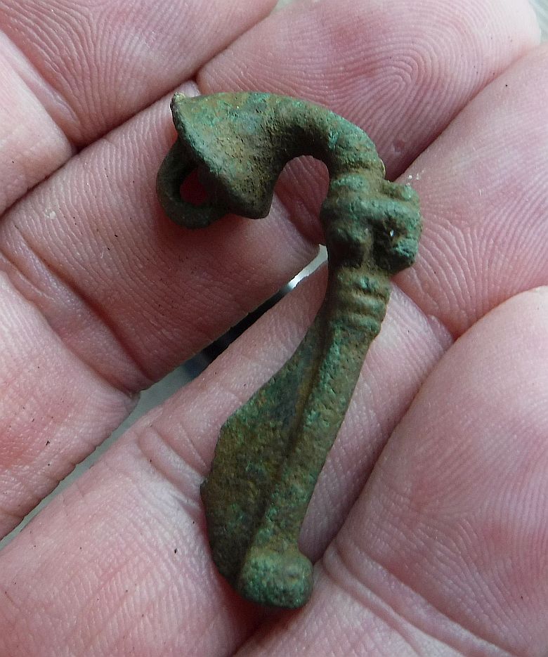 On the last day, I was determined to find a Roman brooch as it has been on my wish list since I started detecting. I was keeping the search coil low and slow, listening for the slightest hint of a good signal, as the easy and shallow targets had all been removed from the area by the detectorists who had searched it extensively for the last week. I had just finished digging yet another shotgun cartridge when I fixed onto my next target. Another scratchy signal that sounded identical to the previous shot gun cartridge, but as we say, ‘It’s just one more hole,’ (Neither of us ever walk away from any positive signal, regardless of how scratchy it is, as you just never know what that target could be). To my surprise and delight, it was a 1,800 year old Roman trumpet brooch in great condition. I could not believe that I had finally found one and I spent the rest of the day grinning and looking at my ancient treasure.