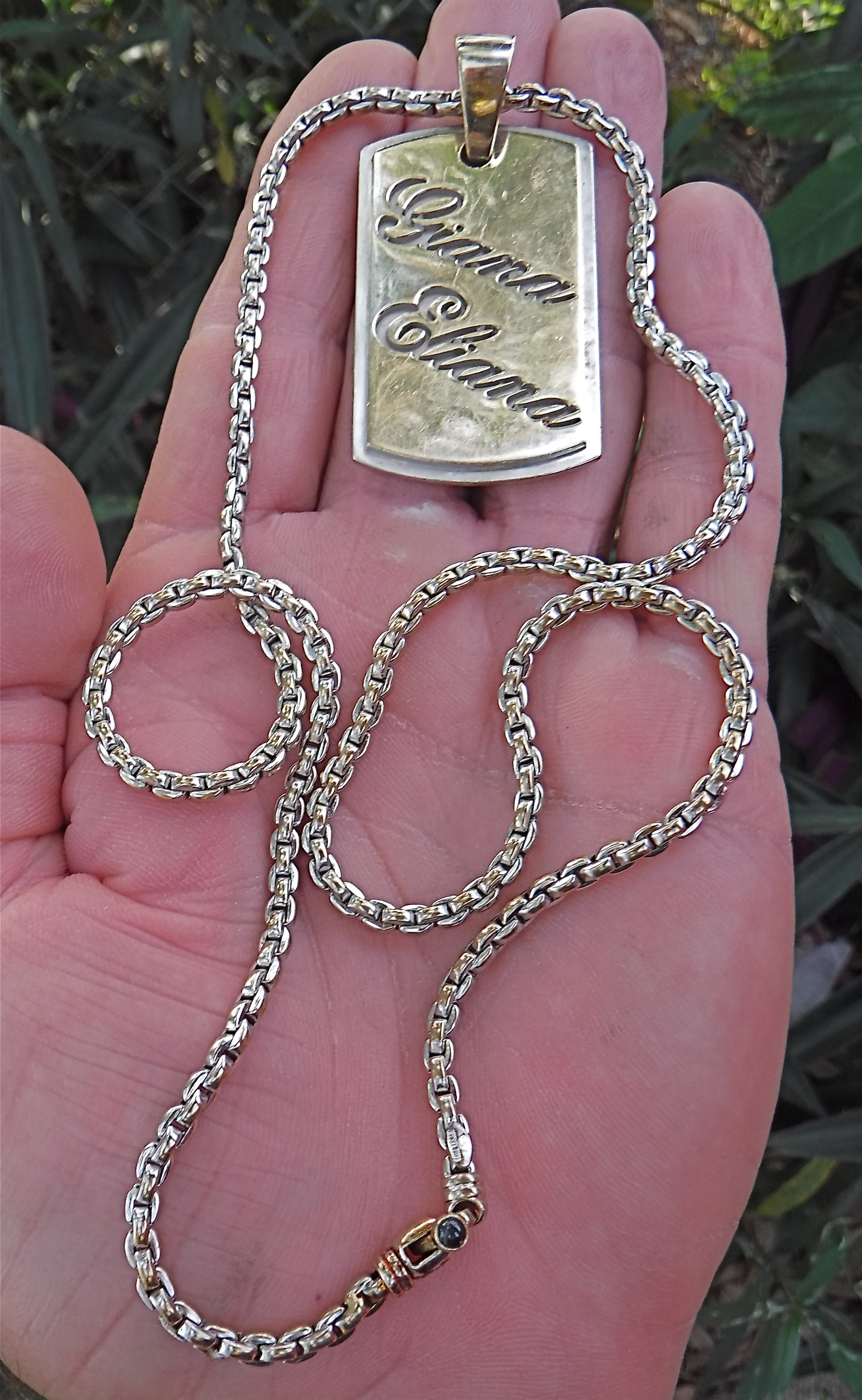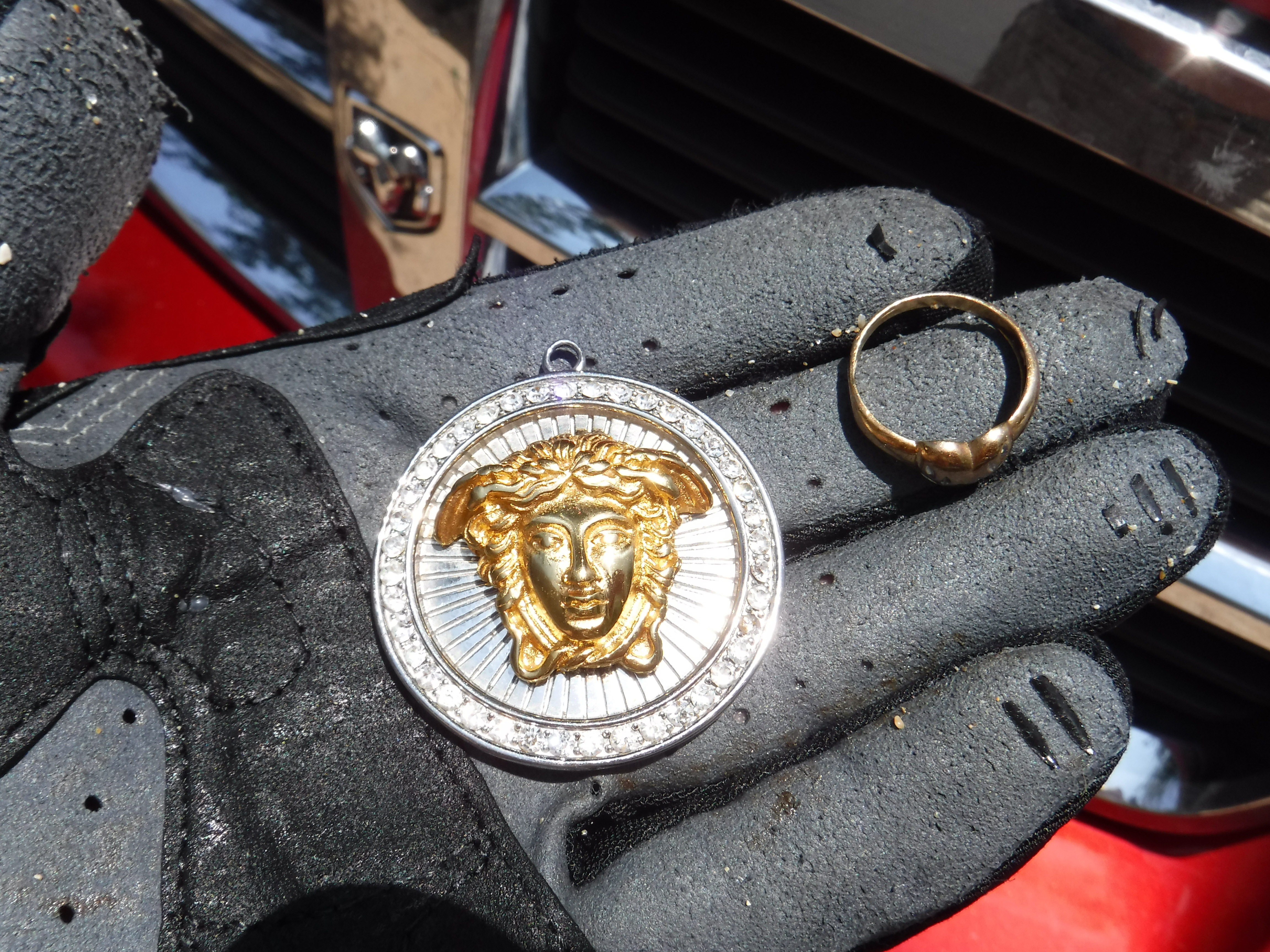 This has been a strange year for me. Although my metal detecting time has been restricted to weekends, my gold numbers are ‘through the roof’ in the first six months of the year. I broke through the one pound mark of gold jewelry recently, recovering a Versace diamond encrusted platinum & 18 K gold pendant, weighing a whopping 1.7 ounces. Also, earlier in the year I recovered a 3 ounce white and yellow gold chain with pendant and a sapphire clasp.