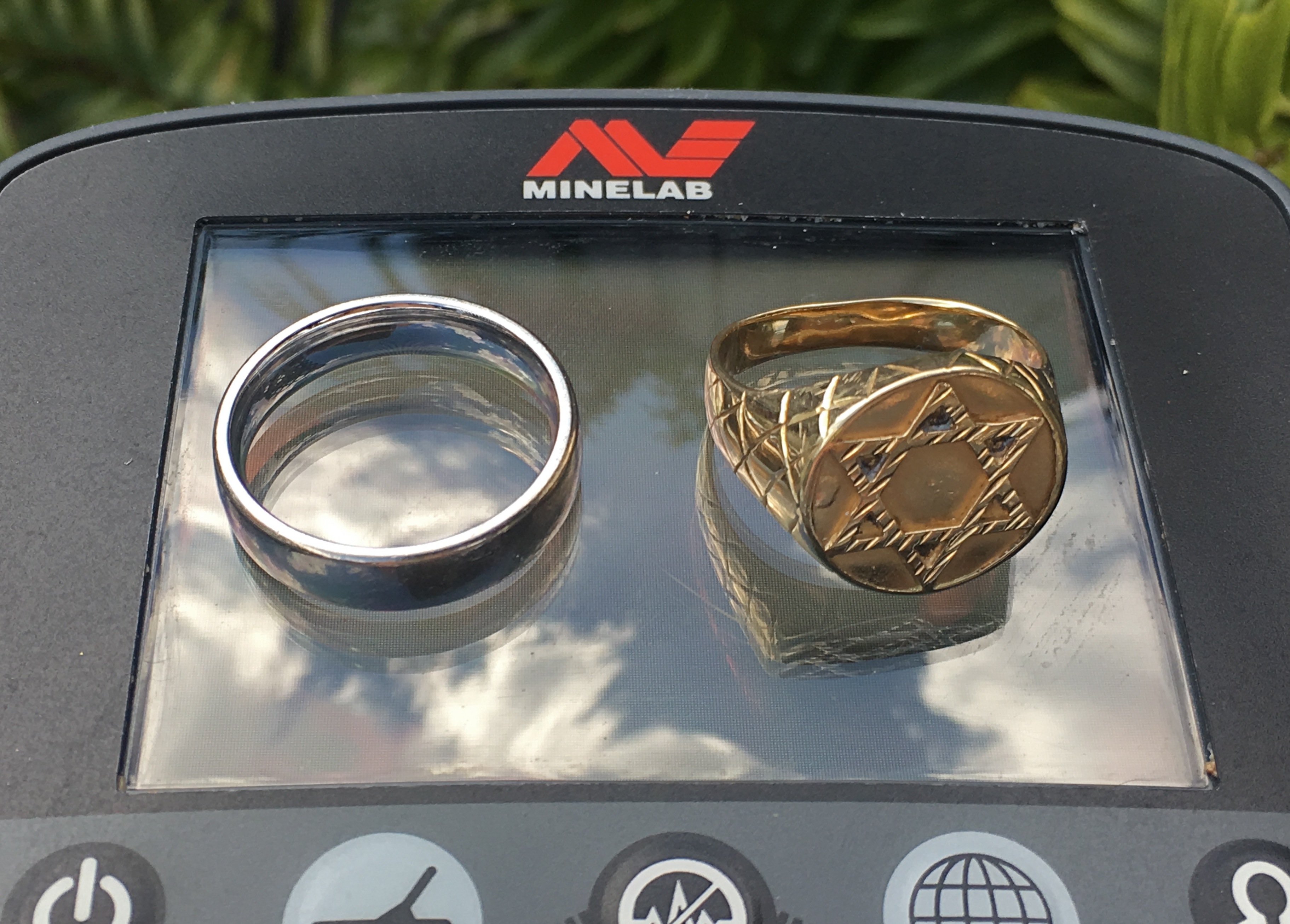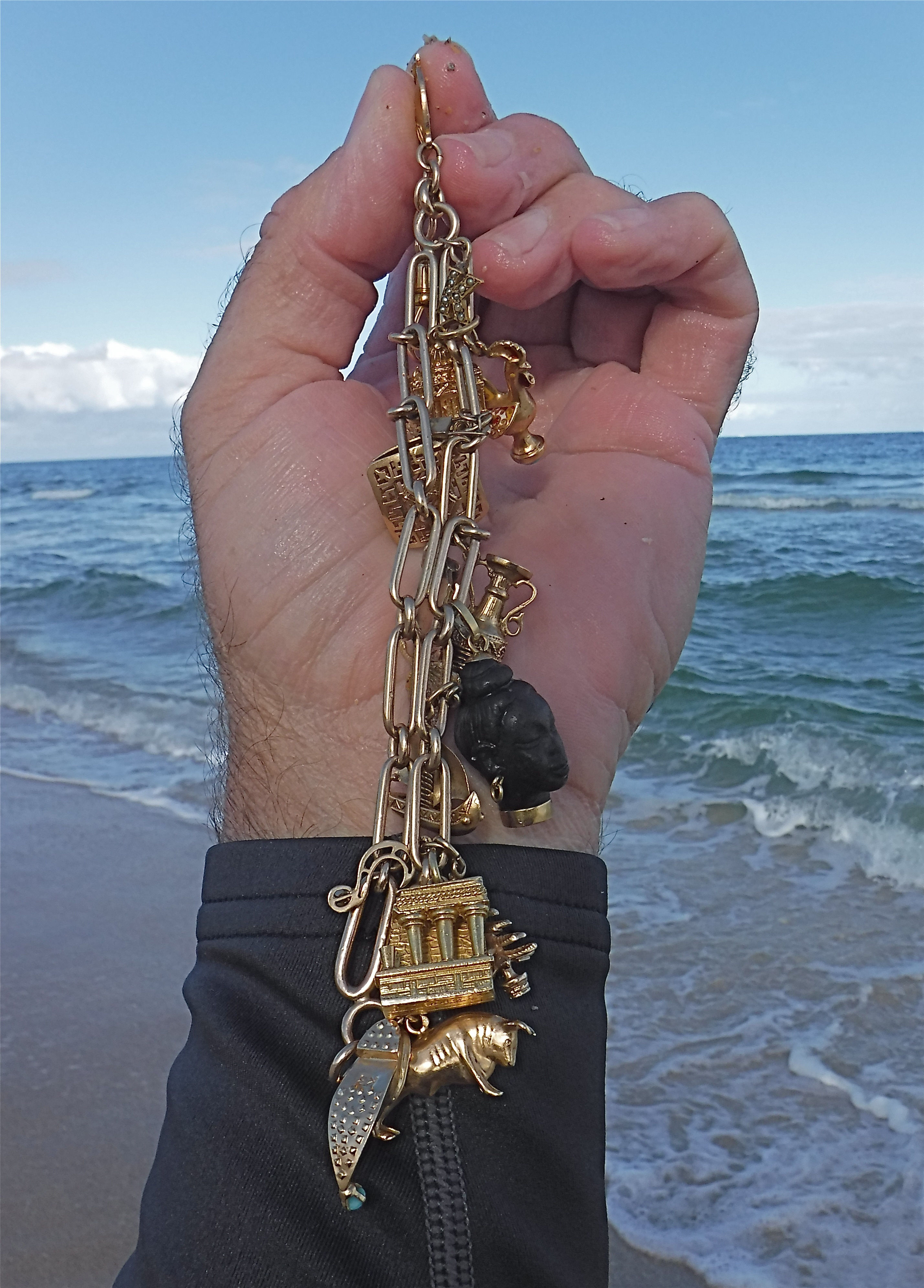 Below is another 2.6 ounces of gold, being a mega gold charm bracelet pulled out of my scoop basket earlier in the year. Although the heavy gold charm bracelet is a large attractive target, it responded with a faintest of audio tones, as deep gold often does. The two heavy half ounce gold rings were recovered in a similar fashion this year, using my custom CTX 3030 beach mode and gold audio target tone to sniff out deep gold beyond the range of ordinary metal detectors.