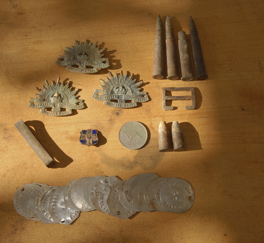 My PRO-FIND was telling me there was still more in there, so it was time to make the hole a bit bigger. More digging and out came a couple of live .45 caliber rounds, then a shiny round disk, hang on I said, this looks like an ID disk, now commonly know as “dog tags”. I put my had back into the soil and came out with a handful of tags, what was going on, two hat badges, bullets and ID tags all in the one hole. More checking and the hole was at last empty. Time to move on as we needed to get back for lunch, they say an army marches on its stomach and so do I!