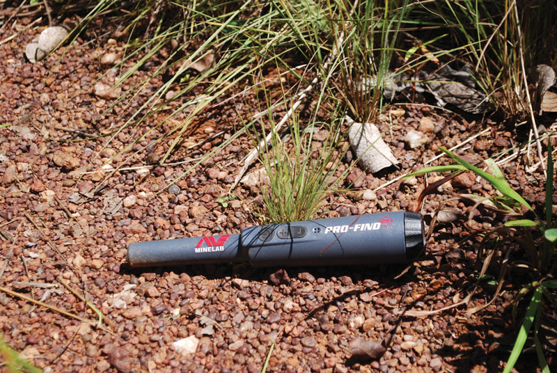 By this stage the signal was booming and I found myself silently cursing the fact I had not included my PRO-FIND 25 on my belt, this meant I had to guestimate where the signal actually was, which was very hard to do, because the signal was so loud! I had two choices, either enlarge the hole, which would require huge amounts of extra effort, or keep pounding at the by now pinching bottom of the hole. Lifting the pick up high above my head I swung with all my force driving the point deep into the quartz and clay hard pack, scooping out the resultant spoils I waved the coil over the pile and had the pleasure of the detector overloading on a target at the top of the pile.