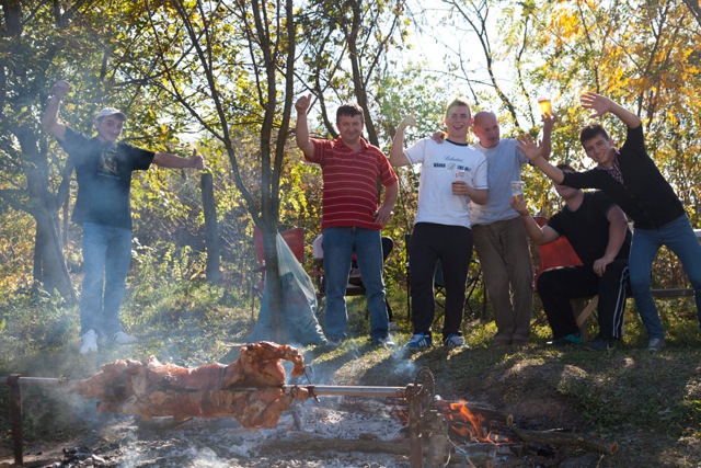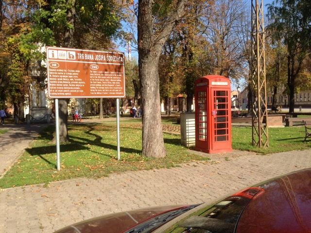 I made it to the hotel restaurant around 8am for the first coffees of the day with strict instructions of being ready to be picked-up at 11am. Steve was having a house warming party, and we were told; the local “village people were eager to meet us.” So with time to kill, I finished my breakfast of bacon and eggs, met up with Sheddy and we went for a walk into the centre of Vinkovci. All the shops were closed for Sunday, but there were loads of busy alfresco cafés doing a roaring trade. In our travels we saw roman remains as well as shrapnel scares on many of the buildings from the recent Serbian invasion. The weirdest site was the British red telephone box in the centre of Vinkovci, something Cibs had been given for all his UK charity work. This was installed with a Croation public phone. I have to say it smelled exactly the same as the Phone boxes back in the UK, so the Croatians had embraced British phone box culture… if you get what I mean.