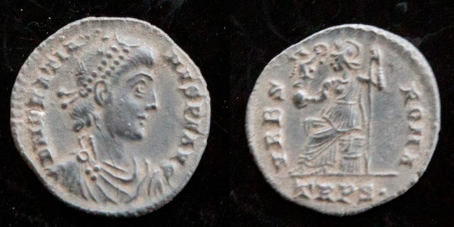 After digging a few lumps of broken drinks cans, I got a sweet repeatable high pitch signal, which I dug to retrieve a black roman coin with a perfect bust of an emperor. I shouted to Steve "I've found a Siliqua'. I didn't know what a big deal this was, we often find them in the UK, but this is not so in Croatia where they are a lot rarer. Steve ID'ed the coin as Gratian and we all agreed it was a lovely coin that I was very skilful in finding... well this is my understanding of the ensuing conversation between Steve and our two Croatian detectorist guides!