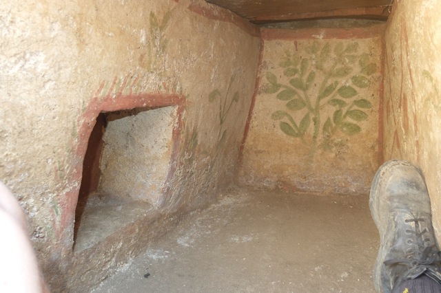 Before leaving the site I was asked if I would like to look inside one of the graves. I made my way down into a pit where there was a miniature stone construction that resembled a house with an apexed roof. I then crawled in feet first and took photos of the wall paintings while laying in the same position as its original occupant.