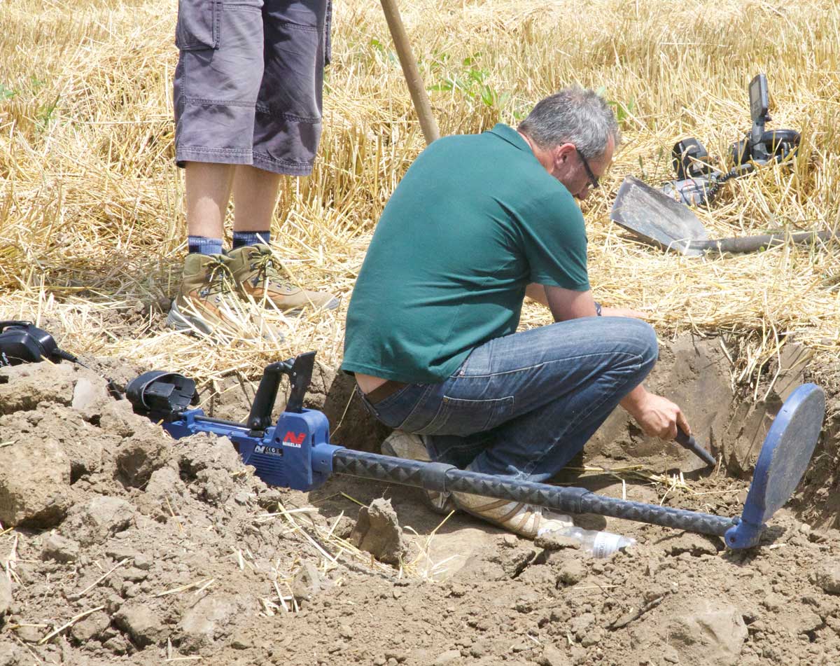 So getting bored I took the SDC 2300 from its travel bag, and took it to the areas where the coins were found. Beside one of the recently dug holes I got a clear signal, and digging down eight inches I recovered coin four. This was very deep for such a small coin, and this discovery impressed one of the Archaeologists enough to ask if he could have a go.