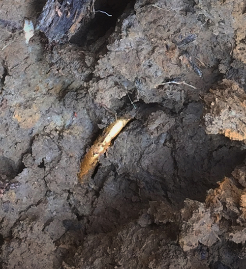 One of the targets not detectable with the Explorer turned out to be very deep. Dean had opened up a large hole to 18" and asked me to check the signal with the GPX 4800, which I did, it was still dead centre in the hole. We then took turns digging down to two feet and finally the pinpoint probe started to detect it. Dean then carefully dug deeper, into what looked like rusty soil. He put the pinpointer into the soil and it screamed indicating a target was close. Dean exclaimed it must be iron because of the rusty looking soil and scooped out. Then jabbing the probe at the spoil he said "There it is, iron". I picked up the lump he referred to and the soil fell away to reveal a lovely Norfolk Wolf gold stater, dating to 50 BC. Dean then placed his spade into the hole and marked the depth on the handle. The mark was later measured at 26", the deepest coin either of us had ever dug.
