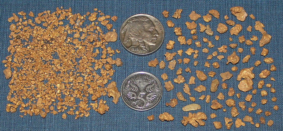 Here are 36 grams of California gold – on the right of the coins, 113 nuggets detected directly with the SDC 2300 totaling 20 grams, and on the left, 16 grams of gold found with the dry washer / dry blower in patches found by the SDC 2300. There are some nuggets which were found with the dry washer that are large enough to have easily been seen with the SDC 2300, but they were too deep for the detector to see them. As the ground was dug up, the dry washer captured them.