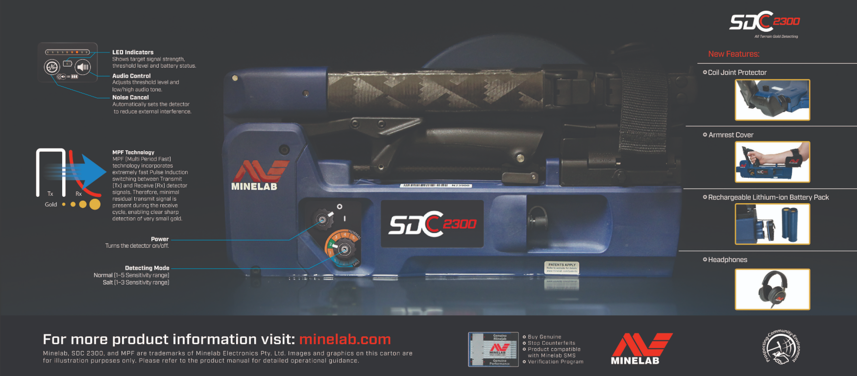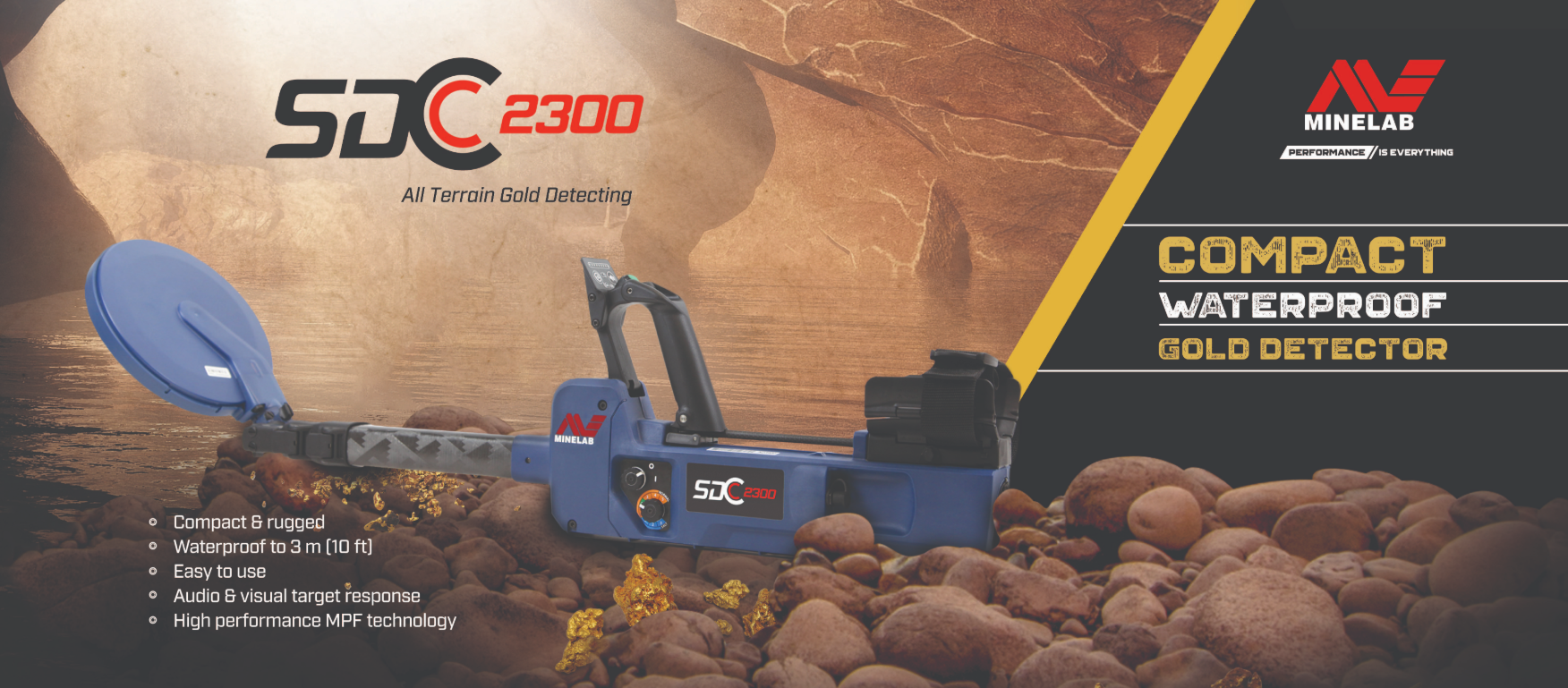 The rugged SDC 2300 is a portable gold detector which collapses and transforms into a full-sized 1500 mm (59.1 in). The body is constructed of military-grade material and features a sturdy, full carbon fibre shaft and an 8-inch Monoloop coil. The SDC 2300 allows detectorists to discover gold patches on land and underwater at depths of up to 3 m (10 ft) with settings for both normal and salt sensitivity ranges. It is extremely sensitive to small nuggets. Other features include automatic noise cancellation, automatic ground tracking (AGT) and 9 LED indicators on the display.